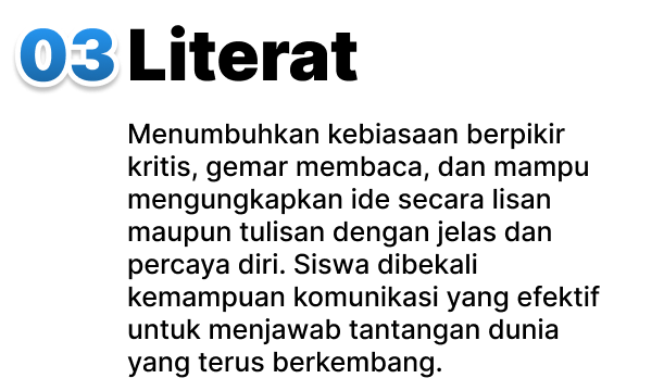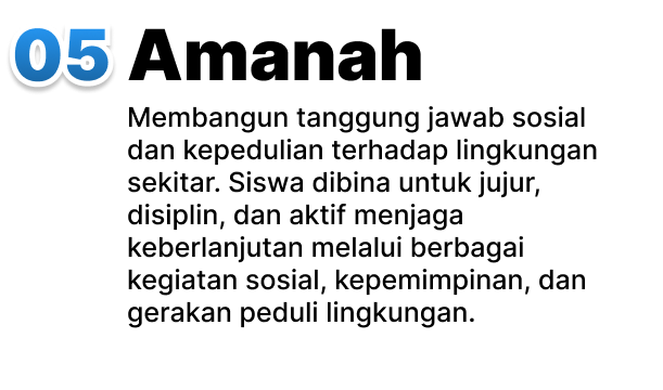 Kurikulum MULIA dirancang untuk membentuk siswa yang mandiri, unggul, literat, beriman, dan amanah melalui pendidikan yang menumbuhkan karakter. Lebih dari sekadar ilmu, kurikulum ini mendorong pemikiran kritis dan tanggung jawab sosial. Tujuannya, mencetak generasi pemimpin yang siap berkontribusi bagi masa depan bangsa.