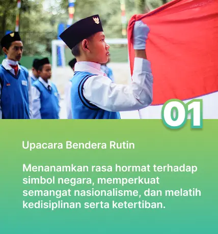Di Sekolah Al Bunyan Boarding School, kami menanamkan nilai kebangsaan agar siswa tumbuh dengan cinta tanah air, semangat nasionalisme, dan kepedulian terhadap bangsa dan negara. Melalui berbagai kegiatan terarah dan kontekstual, siswa diajak untuk memahami arti penting persatuan, menghargai keberagaman, serta menjalankan peran aktif sebagai warga negara Indonesia yang bertanggung jawab dan siap berkontribusi bagi kemajuan bangsa.