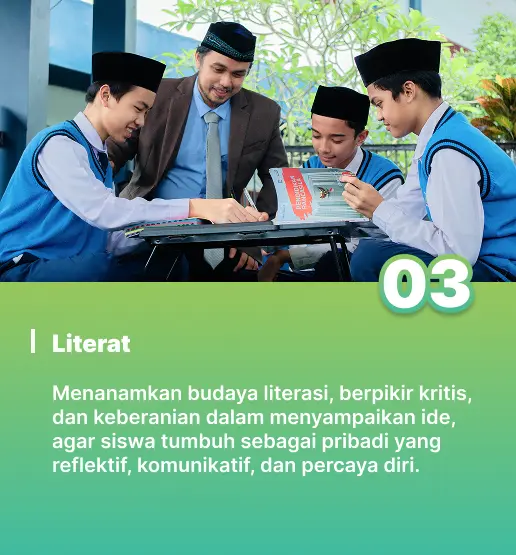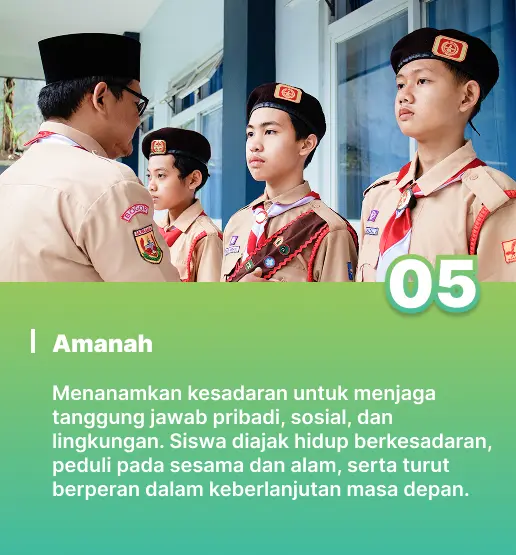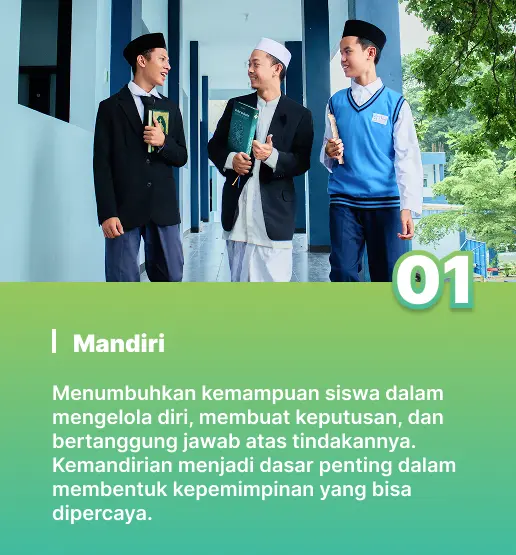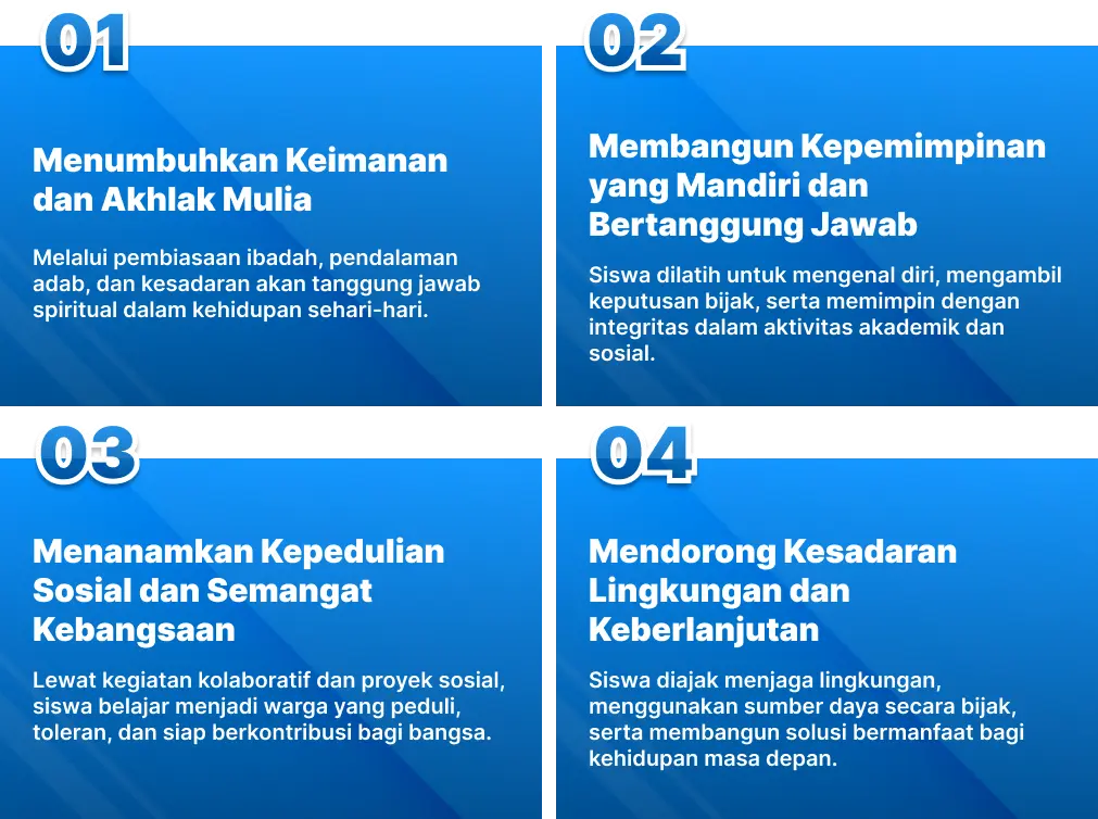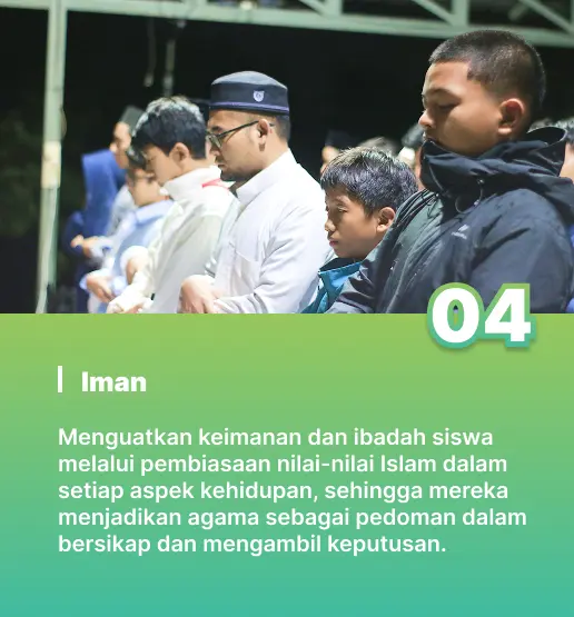 Di Sekolah Al Bunyan Boarding School, kami meyakini bahwa pendidikan yang utuh harus menumbuhkan siswa tidak hanya dalam hal pengetahuan, tetapi juga dalam akhlak dan spiritualitas. Karakter keislaman yang dibina mencakup akidah yang lurus, ibadah yang benar, akhlak yang mulia, dan kepedulian terhadap sesama. Setiap aktivitas harian—baik di kelas maupun di asrama—dirancang untuk membentuk kebiasaan hidup yang sesuai dengan nilai-nilai Islam secara menyeluruh, konsisten, dan membumi dalam keseharian.